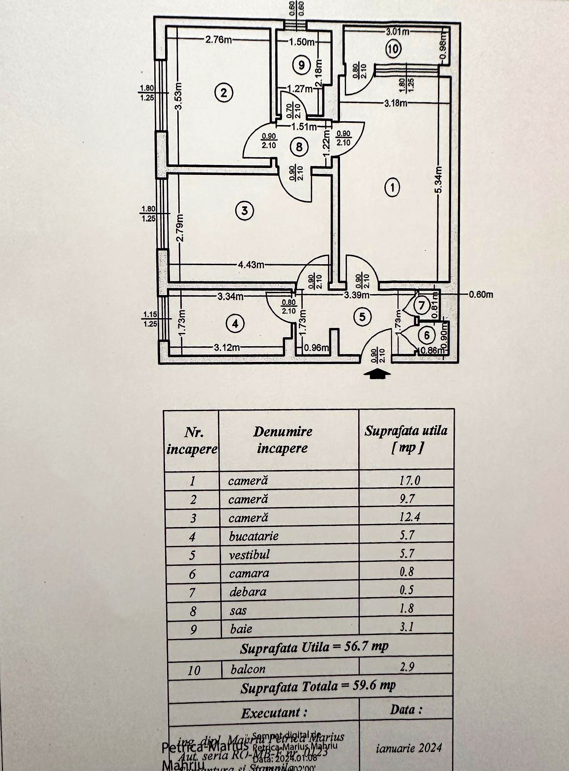 Este dispus pe o suprafață totală de 59,60mp din care 56,70mp utili și este compus dintr-un living generos, bucătărie inchisa, dormitor principal, dormitor secundar, baie cu geam, vestibul generos (dressing), camara, debara, 2 hol-uri și balcon.