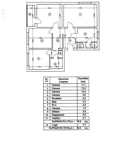 Apartamentul este dispus pe o suprafata totala (cu balcon) de 80.6mp, suprafata utila (fara balcon) fiind de 76.9mp si este format din living, bucatarie inchisa, cu cămară, mobilata si utilata, 3 dormitoare, baie cu cada, grup sanitar, hol si balcon.